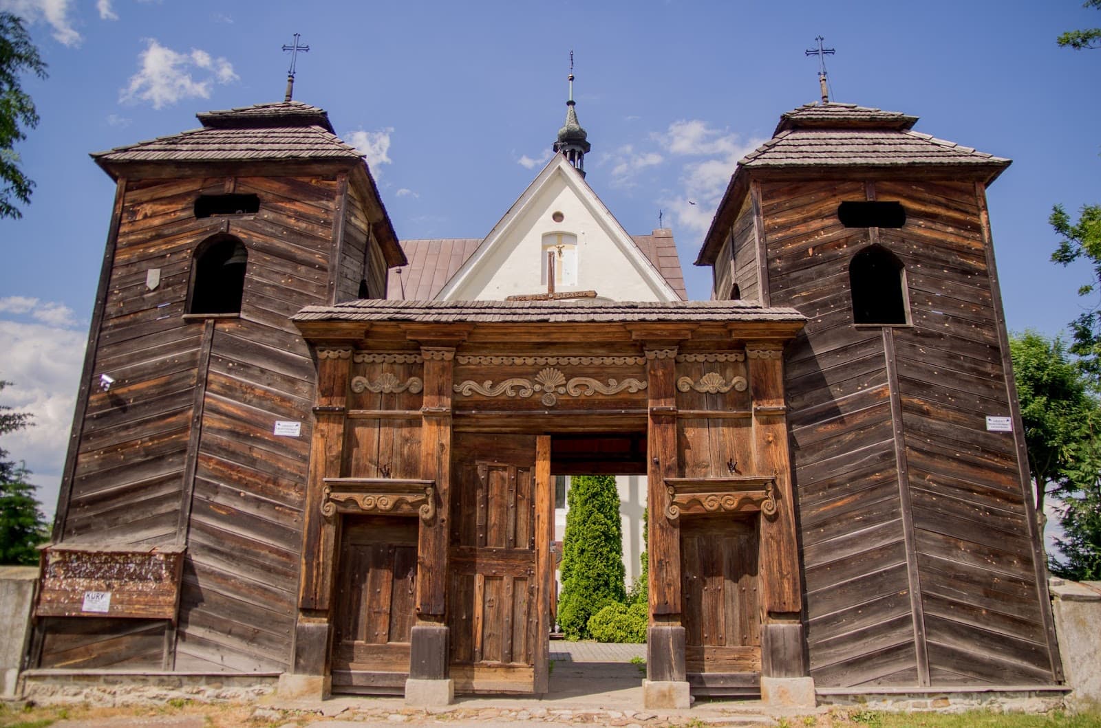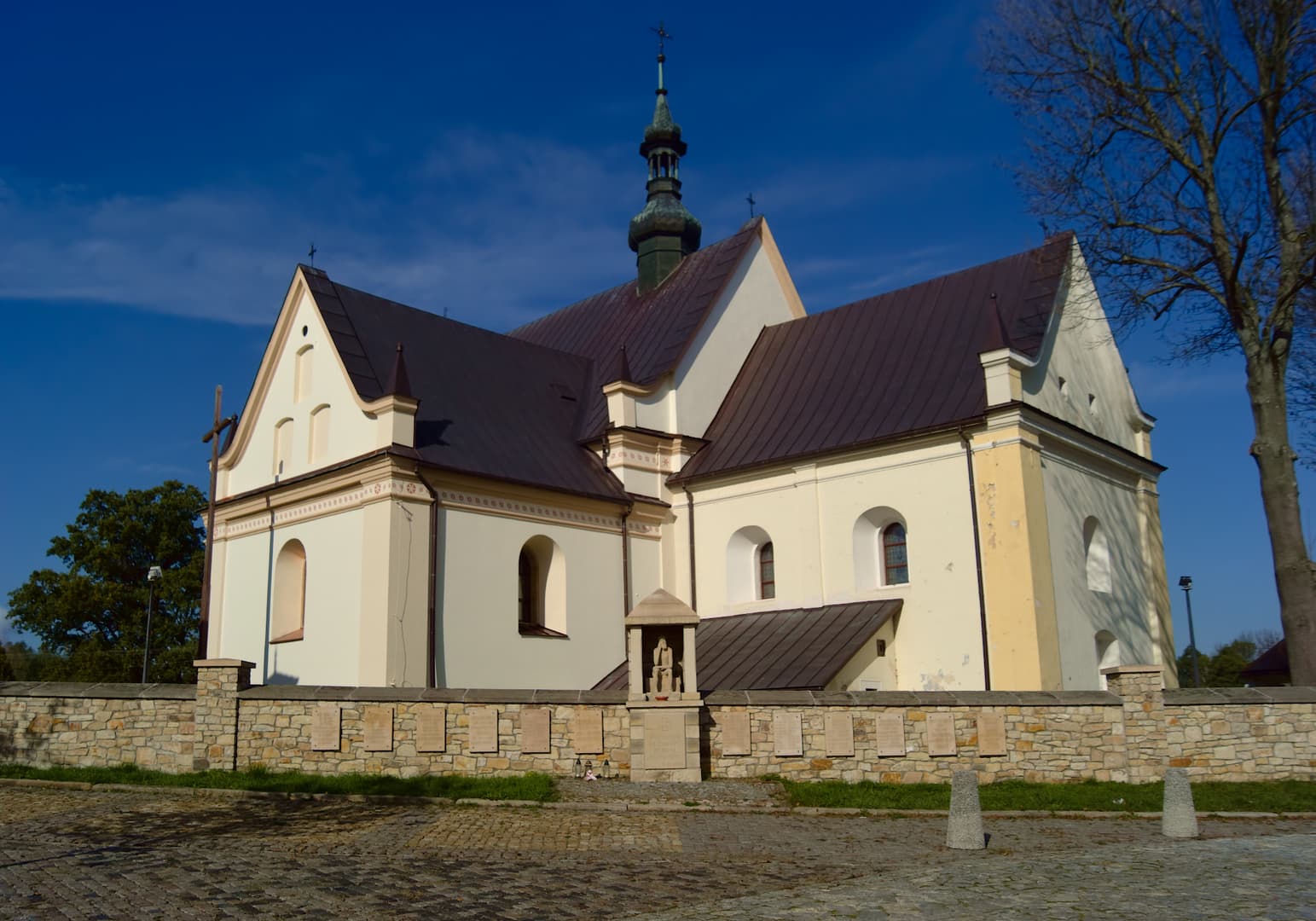 Świątynię pod wezwaniem Wniebowzięcia Najświętszej Maryi Panny wzniesiono w 1727 roku, lecz co najmniej od stu lat wcześniej, na tym samym miejscu stała drewniana kaplica z łaskami słynącym obrazem Matki Bożej. Kościól ma charakter barokowy, nawa jest trójprzęsłowa z dwiema kaplicami w transepcie. W kaplicy północnej znajduje się omawiany obraz Matki Bożej - prawdopodobnie z XVI w. Główne wejście w trójdzielnej fasadzie ozdabia profilowany portal. Dach z więźbą trójstorczykową zwieńczony jest barokową wieżyczką na sygnaturkę. Przed kościołem stoi modrzewiowa, gontem kryta brama i dwie dzwonnice o charakterze barokowym z 1779r. Ciesielka jest oryginalna, a niektóre elementy pochodzą z pierwotnego, XIV-wiecznego kościoła. Mieści się tu dzwon z 1581r.. Bramę ozdabiają rzeźbione w drewnie ornamenty. Naprzeciwko dzwonnicy a zarazem bramy wejściowej, znajduje się figura św. Stanisława biskupa. Według niektórych podań może pochodzić ona z II połowy. XVI w. Zabytkowy kościół wraz z dzwonnicą, figurą św. Stanisława biskupa, i otaczającymi go wiekowymi dębami i jesionami stanowi ciekawy element krajobrazowy. Warto przespacerować się alejkami starej części cmentarza parafialnego, by obejrzeć oryginalne nagrobki z I połowy. XIX w.. Na murach okalających kościół utworzono Mur Pamięci z licznym tablicami upamiętniającymi ważne osoby i wydarzenia z lokalnej hisorii.