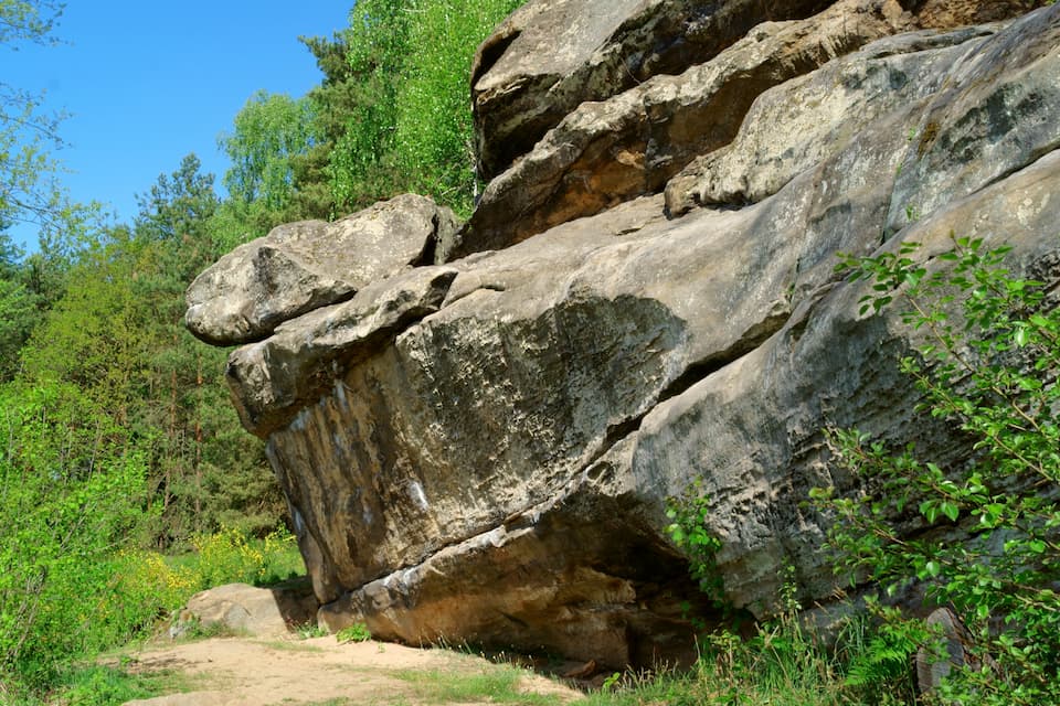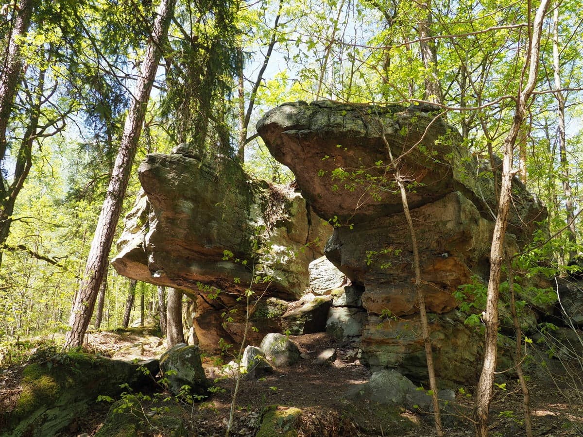 Skały w Rudzie położone są na malowniczym stoku nad Zalewem w Brodach. Występują tam niezliczone większe i mniejsze bloki skał, zbudowane z piaskowców dolnotriasowych. Najciekawsze z nich są pomnikami przyrody np. monolityczna baszta o wysokich, pionowych ścianach oraz pobliskie, ośmiometrowe urwisko z półką skalną o długości 20 metrów i niższą u podstawy. Każda skała jest tu niepowtarzalna, może zachwycić swoim kształtem, drobną rzeźbą powierzchni, różnorodnością kolorów i porastającą florą. Niektóre bloki zbyt głęboko podcięte u podstawy przez procesy wietrzenia przewróciły się tworząc ciekawe układy przestrzenne. Kamienne podłoże stanowi tu dobre siedlisko dla wielu gatunków porostów i mchów. Występuje tu licznie, w załomach ścian skalnych-paprotka zwyczajna. Na ziemi rozciągają się kobierce konwalii majowej i kokoryczki wonnej. Ciekawe formy przyjmują drzewa rosnące na skałach np. brzoza z korzenia, której wyrastają cztery pnie, czy barokowo poskręcane sosny. Warto zobaczyć także dużą skałę z rosnącymi na niej dwoma dębami próbującymi jakby rozsadzić ją na dwie części.