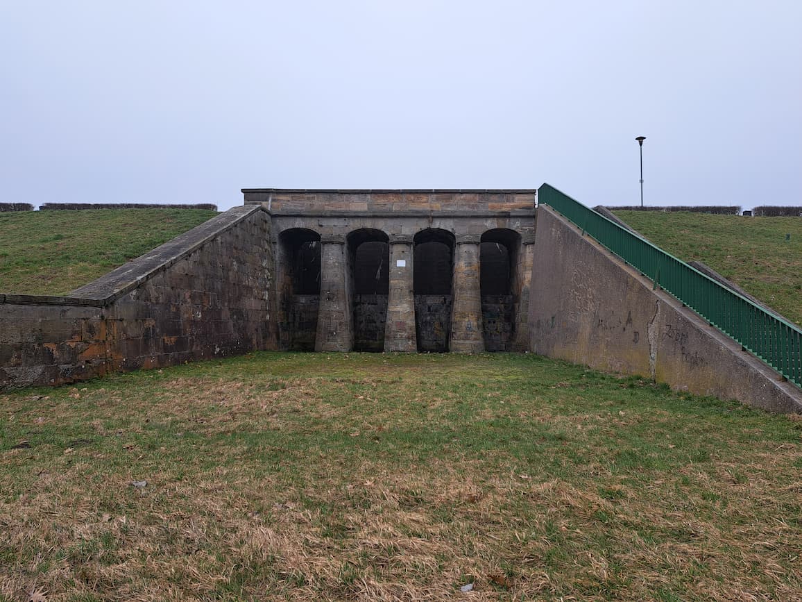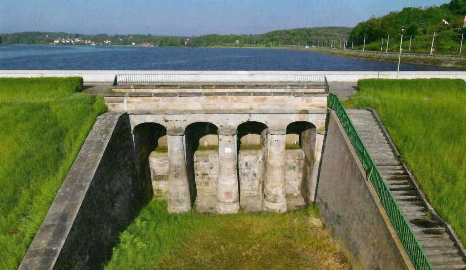 Wybudowana w 1840r. w stylu klasycystycznym. Zachowała się w świetnym stanie architektonicznym. Upust służył niegdyś spiętrzaniu wód Kamiennej, które napędzały urządzenia walcowni i pudlingarni w Brodach. Ten zakład hutniczy stanowił ważne ogniwo w kombinacie metalurgicznym, którego twórcą był St. Staszic. Wyjątkowe w tej budowli są kamienne, estetycznie wykończone sklepienia arkad, ponieważ na ogół nad jazem budowano drewniany pomost. Dziś zamiast glonów pokrywających kamień poniżej lustra wody w szczelinach pionowych ścian, bujnie rośnie paproć - zanokcica murowa, ponieważ upust nie pełni już swojej funkcji technicznej. Przelew jest dobrze znaną „wizytówką” gminy i umieszczony został w jej herbie.